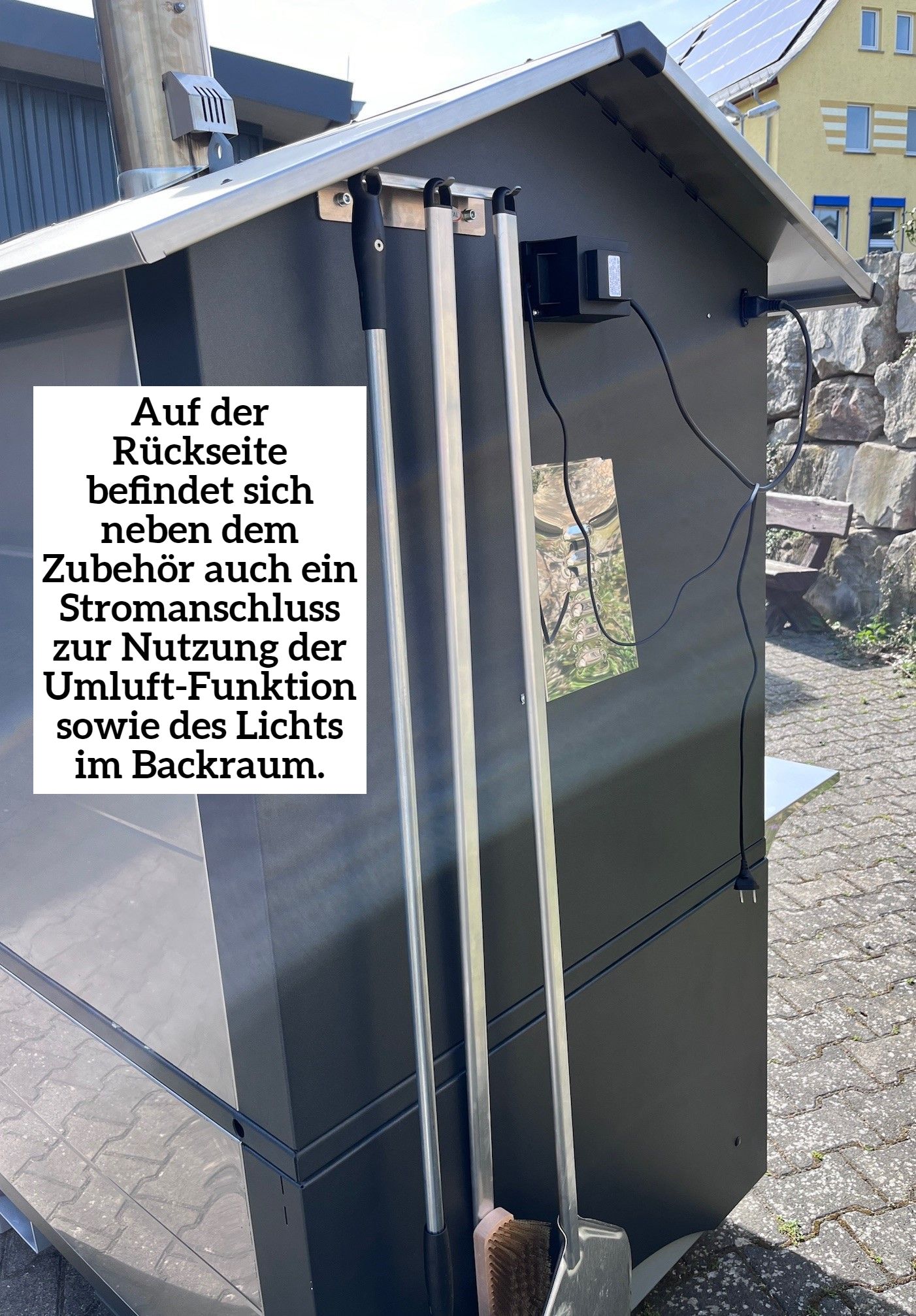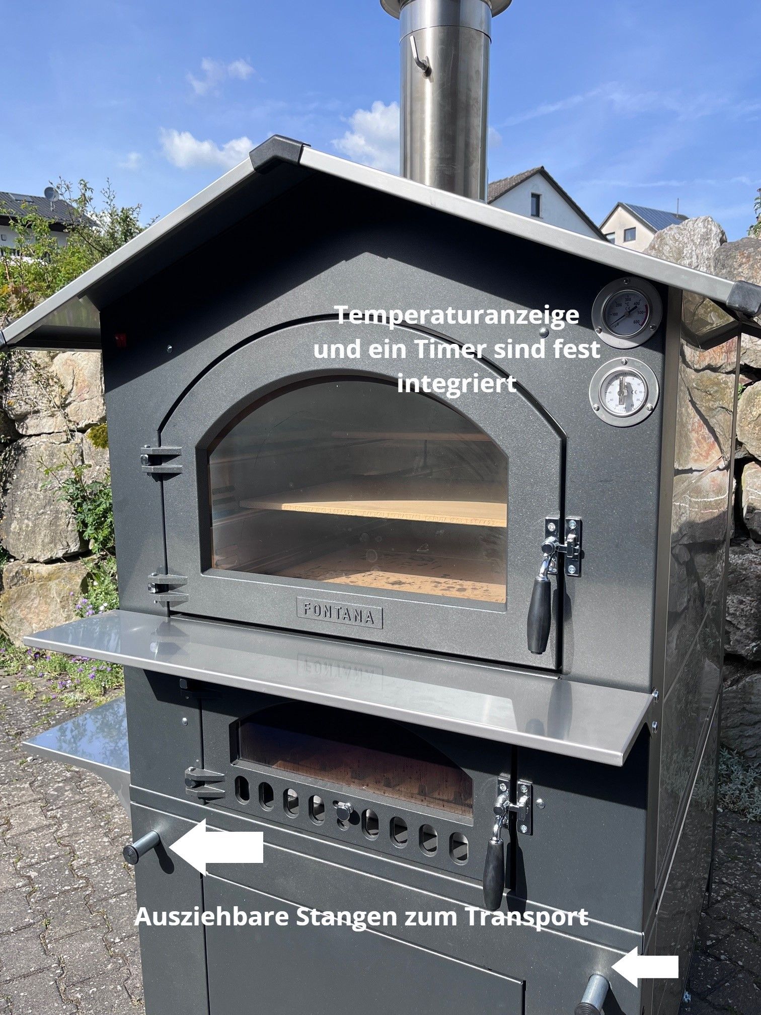Außer den Schamotte-Steinen für 3 Backebenen sind auch Grillroste und Wannen für Aufläufe etc. vorhanden.
